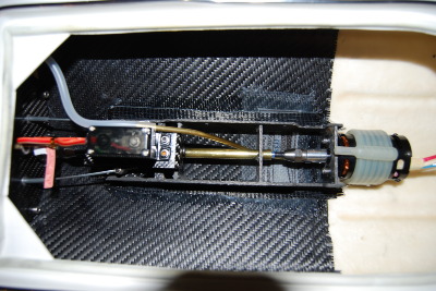 Einbaurahmen aus CFK ist fertiggestellt und einlaminiert. Mit Kühlwasser-Auslass. Servo steht Kopf und hat einen demontierbaren CFK Halter. Der Heckspiegel ist nebst der orig. Holzverstärkung mit 4mm CFK verstärkt.